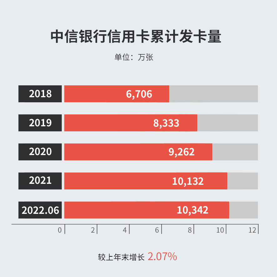 截至2022年6月末,中信銀行信用卡貸款余額5,170.63億元,較上年末下降 2.02%。