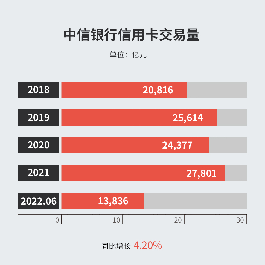 2022年上半年,中信銀行信用卡總交易金額13,835.87億元,同比增長 4.20%。