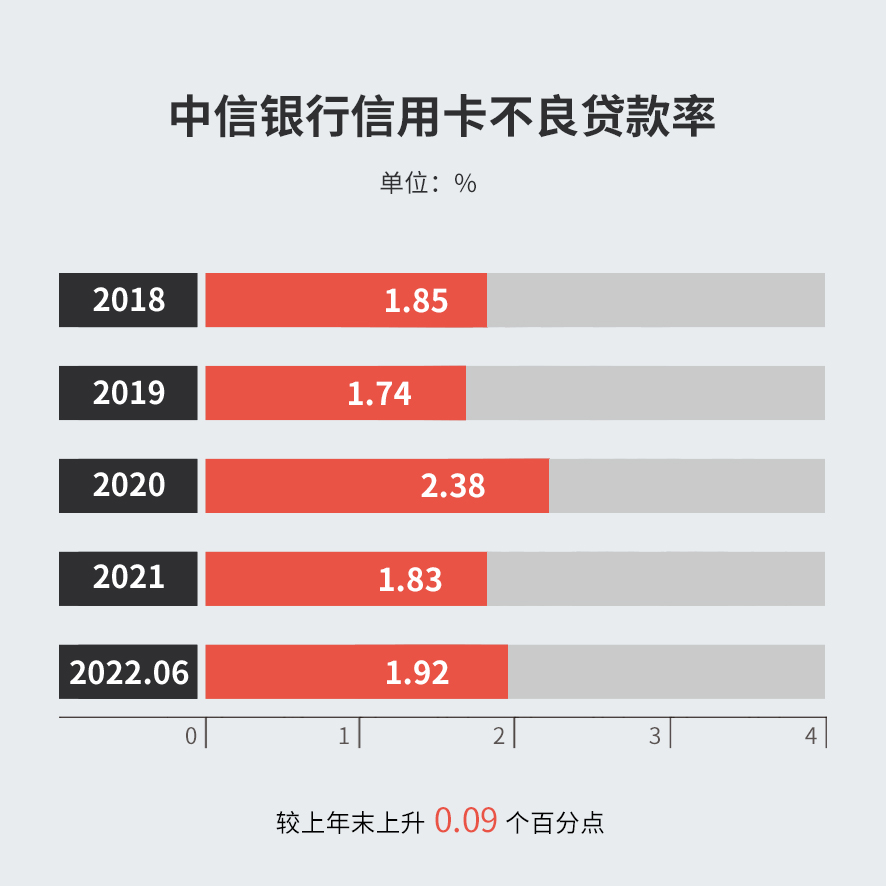 截至2022年6月末,中信銀行信用卡不良貸款余額為 99.06 億元,不良貸款率1.92%,較上年末上升0.09個百分點。