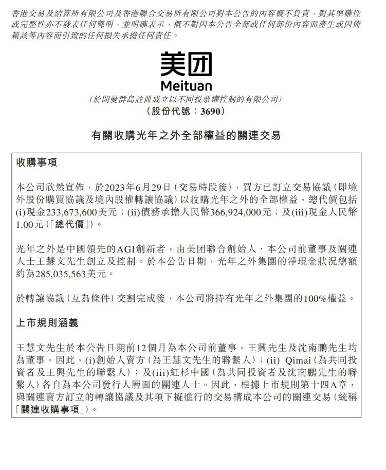 6月29日,美團在香港聯交所發布公告,稱已完成北京光年之外科技有限公司境內外主體100%股權的收購,收購價約為20.65億人民幣。