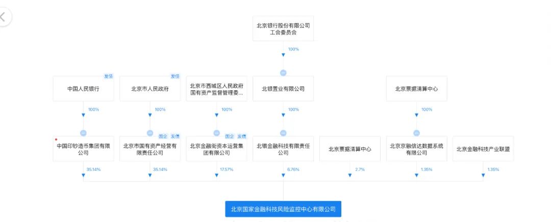 具體來看,國家金融科技風險監控中心由北京市國有資產經營有限責任公司(簡稱“北京國資公司”)、中國印鈔造幣集團有限公司、北京金融街資本運營集團有限公司(簡稱“北京金融街資本”)、北銀金融科技有限責任公司(簡稱“北銀金融科技”)、北京票據清算中心、北京金融科技產業聯盟、北京京融信達數據系統有限公司(簡稱“北京京融信達”)7位股東共同持股。