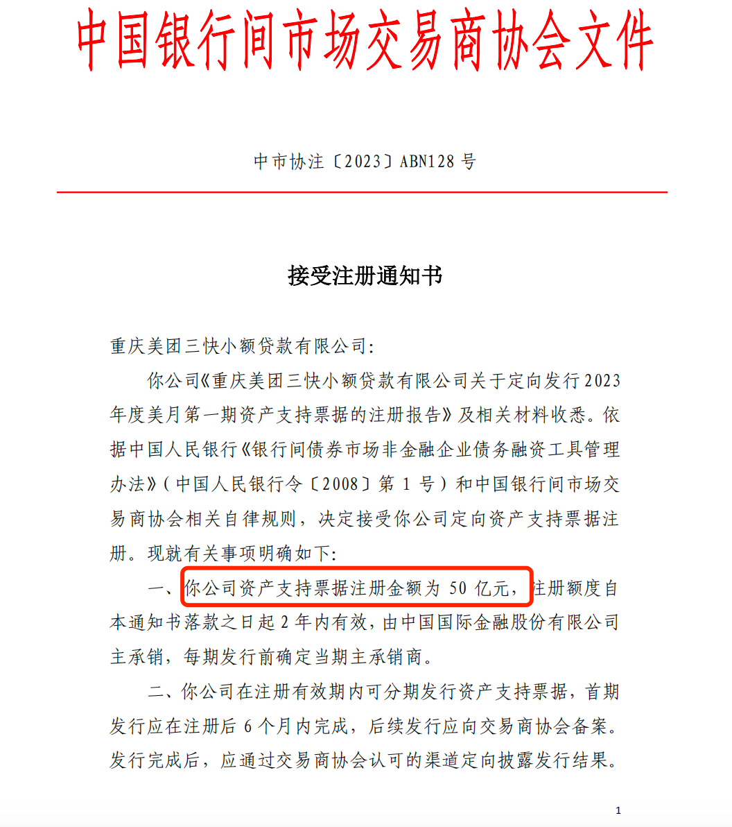 近日,銀行間市場交易商協(xié)會披露文件顯示,接受深圳市財付通網(wǎng)絡(luò)金融小額貸款有限公司、重慶美團(tuán)三快小額貸款有限公司50億定向資產(chǎn)支持票據(jù)注冊。(也就是發(fā)行ABN,類似于之前常說的消費金融公司發(fā)行ABS,是一種融資手段)