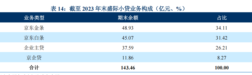 圖表為京東盛際小貸2023年末的業務構成(億元、%)