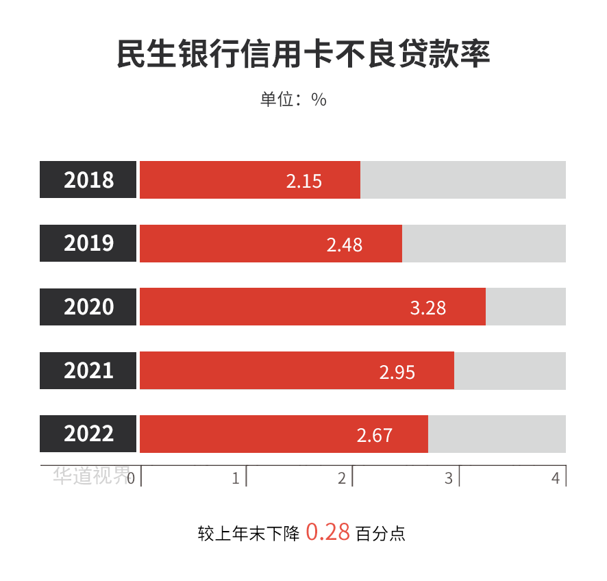 截至報告期末,民生銀行信用卡不良率為2.67%,較上年末下降0.28個百分點;