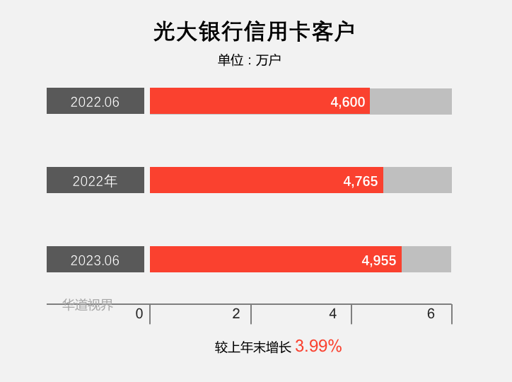 截至2023年6月末,光大銀行信用卡客戶 4,954.58 萬戶,新增 189.92 萬戶;