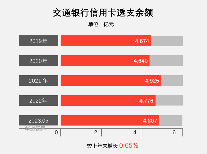 截至2023年6月末,交通銀行信用卡透支余額 4,807.26 億元,較上年末增長(zhǎng) 0.65%;