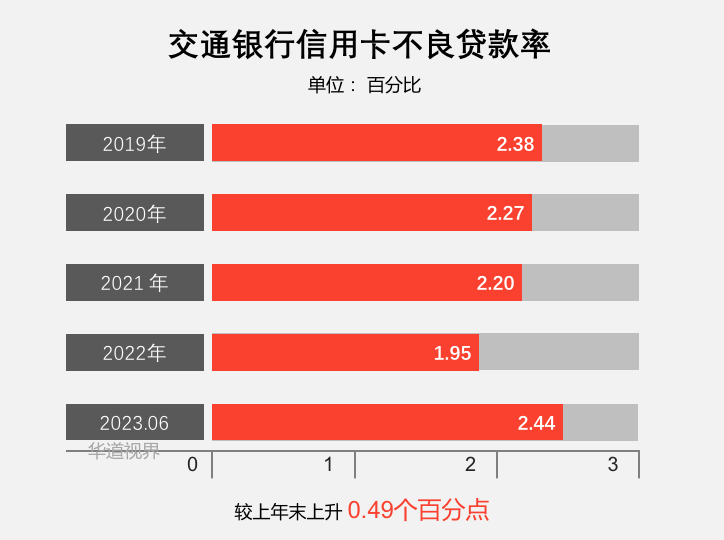 截至2023年6月末,交通銀行信用卡不良率為2.44%,較上年末上升0.49個(gè)百分點(diǎn);