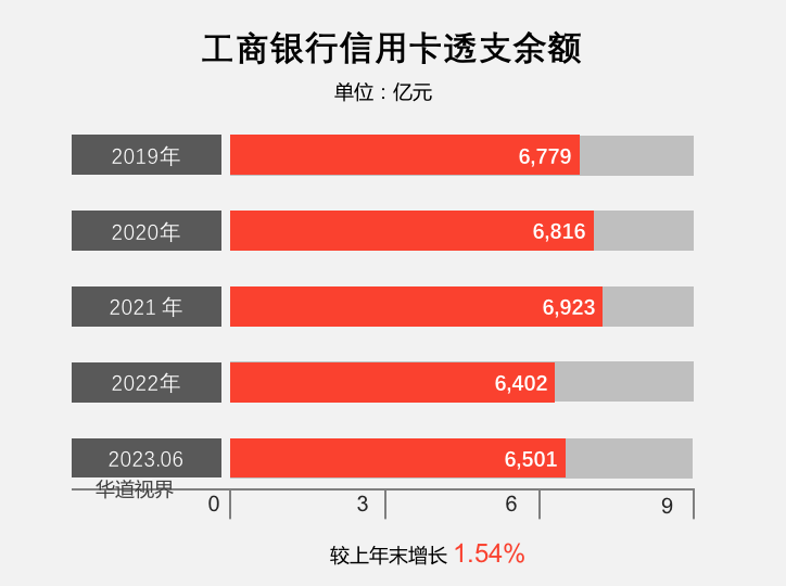 截至2023年6月末,工商銀行信用卡透支余額 6,500.86 億元;