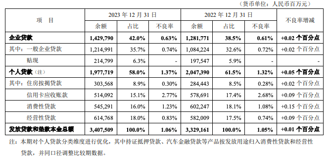 截止2023年末,平安銀行信用卡不良率為2.77%,較上年末上升0.09個百分點;