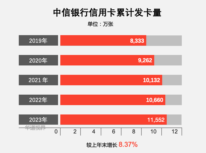 截至2023年末,中信銀行信用卡累計發卡 11,552.06 萬張,較上年末增長 8.37%;
