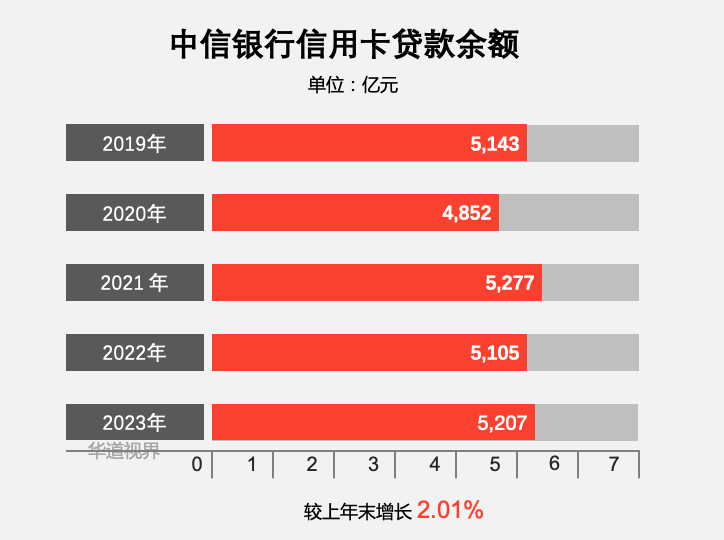 截至2023年末,中信銀行信用卡貸款余額 5,206.91 億元,較上年末增長2.01%;