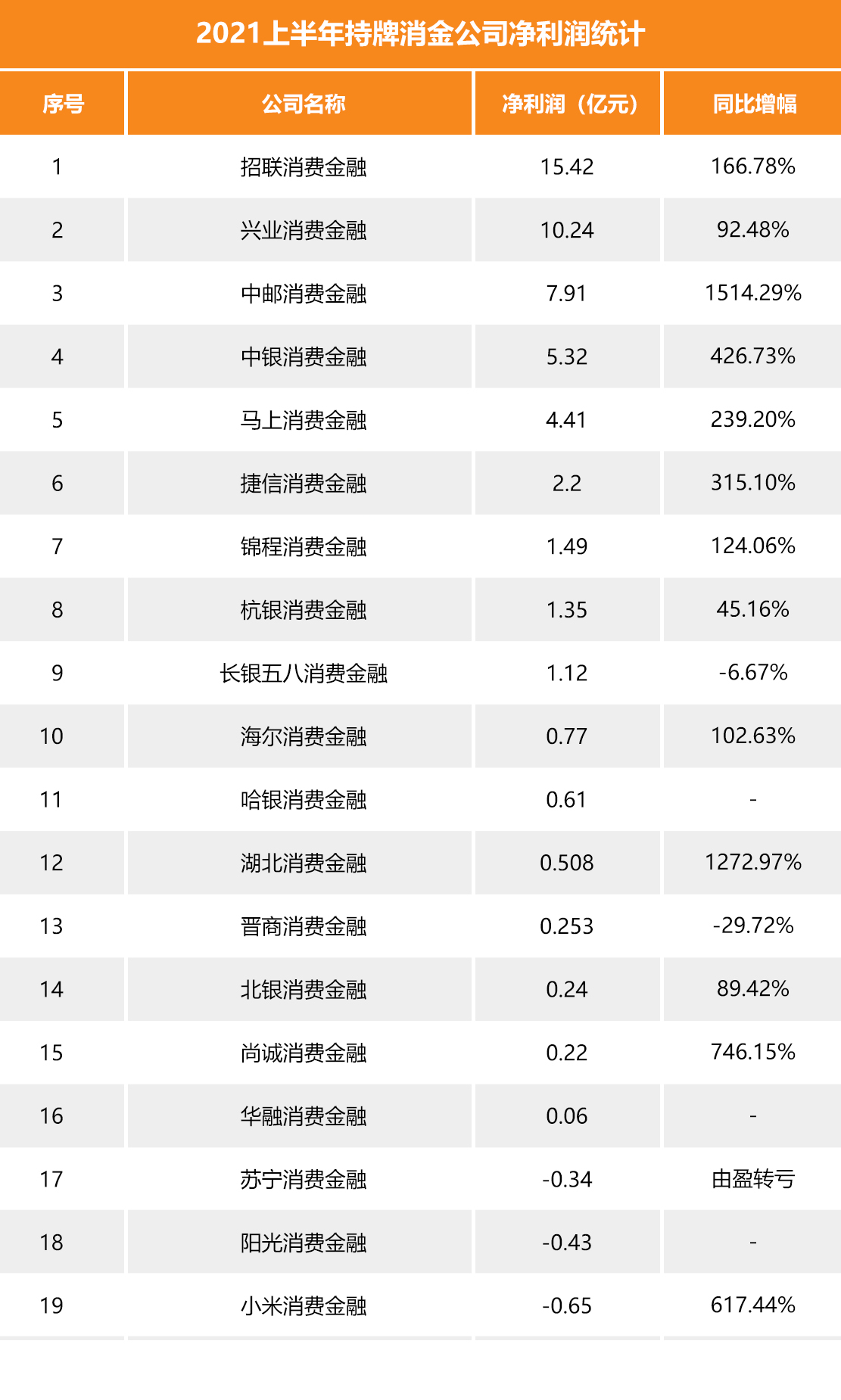 2021年上半年,有19家持牌消金公司披露了其上半年凈利潤數據。其中,16家持牌消金公司實現盈利,招聯消金和興業消金凈利潤均超過10億元,3家出現虧損,分別為蘇寧消金、陽光消金和小米消金。
