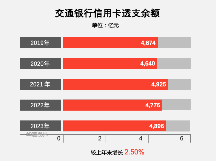 截至2023年末,交通銀行信用卡透支余額 4,896.06 億元,較上年末增長 2.50%;