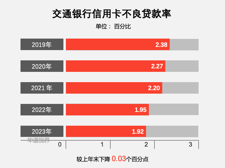 截至2023年末,交通銀行信用卡不良率 1.92%,較上年末下降 0.03 個百分點,持續四年保持下降趨勢。