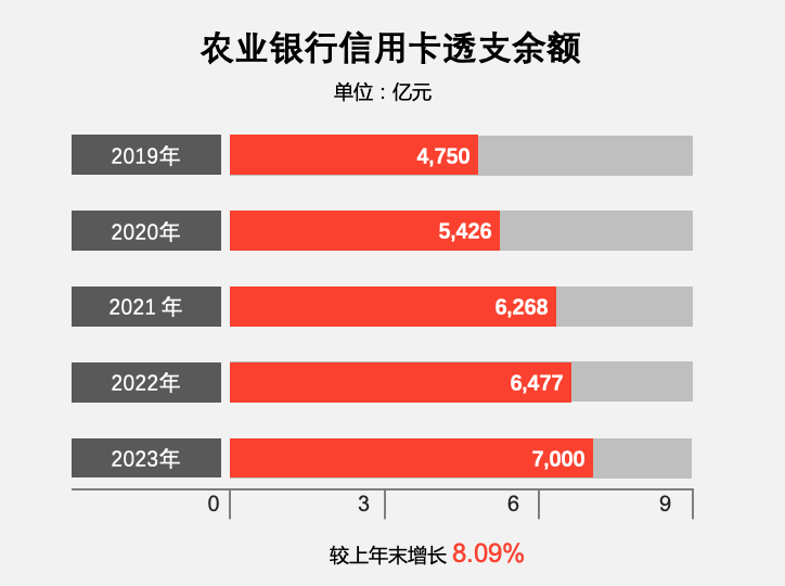 截至2023年末,農業銀行信用卡透支余額7,000.31億元,較上年末增長8.09%;