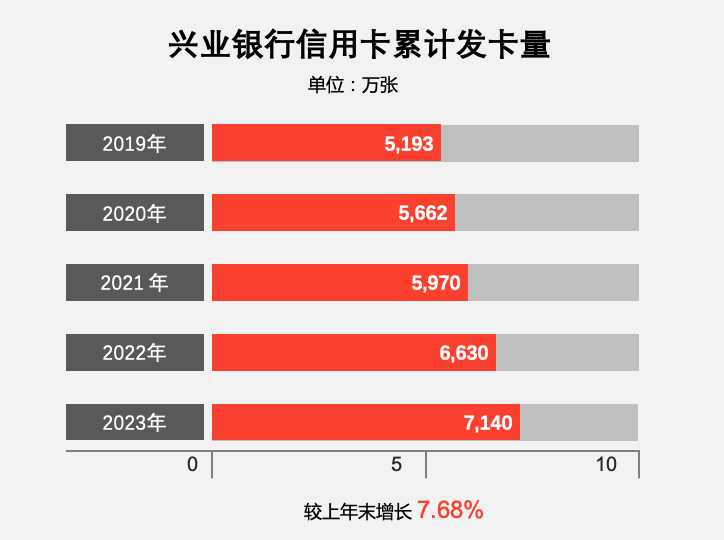 截至2023年末,興業銀行累計發行信用卡7,139.55萬張,較上年末增長7.68%,報告期內新增發卡509.40萬張;