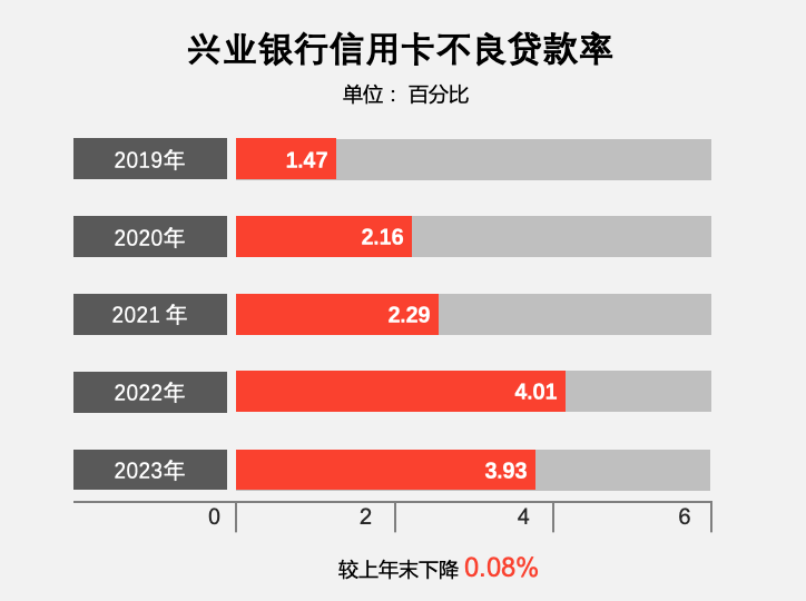 截至2023年末,興業銀行信用卡不良貸款率 3.93%,較上年末下降 0.08 個百分點,風險指標高位回落;