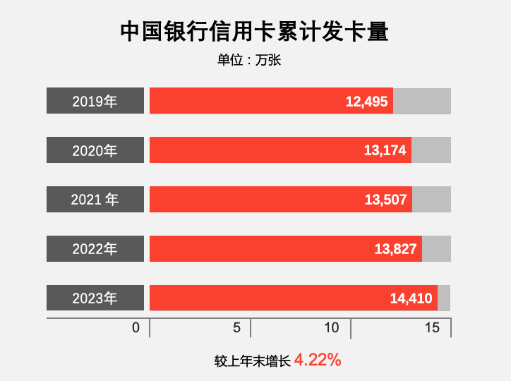 截至2023年末,中國(guó)銀行信用卡累計(jì)發(fā)卡量14,410.19萬(wàn)張,同比增長(zhǎng)4.22%;