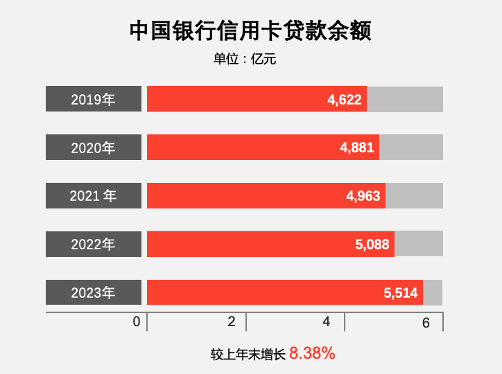 截至2023年末,中國(guó)銀行信用卡貸款余額5,513.66億元,同比增長(zhǎng)8.38%;