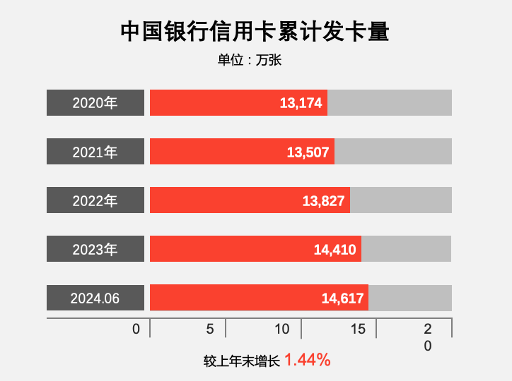 截至2024年6月末,中國銀行信用卡累計發卡量14,617.14萬張,較上年末增長1.44%;??