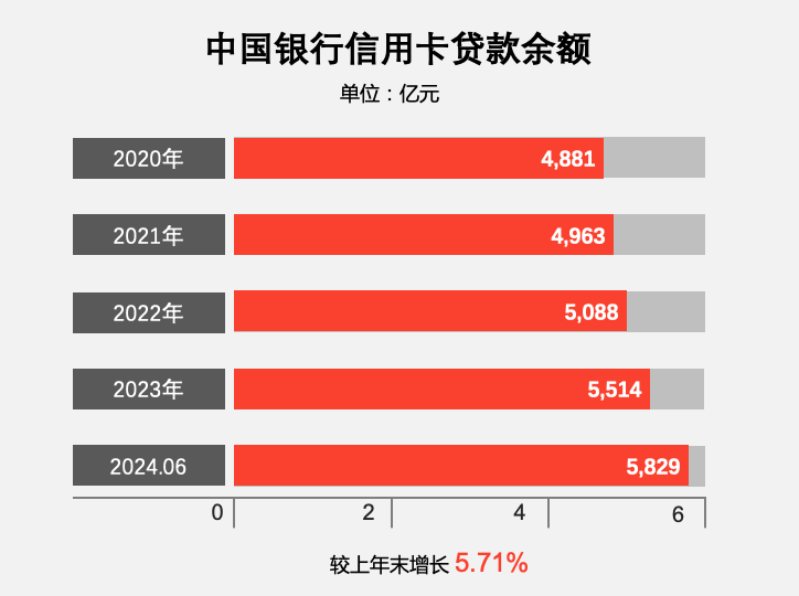 截至2024年6月末,中國銀行信用卡貸款余額5,828.52億元,較上年末增長5.71%;