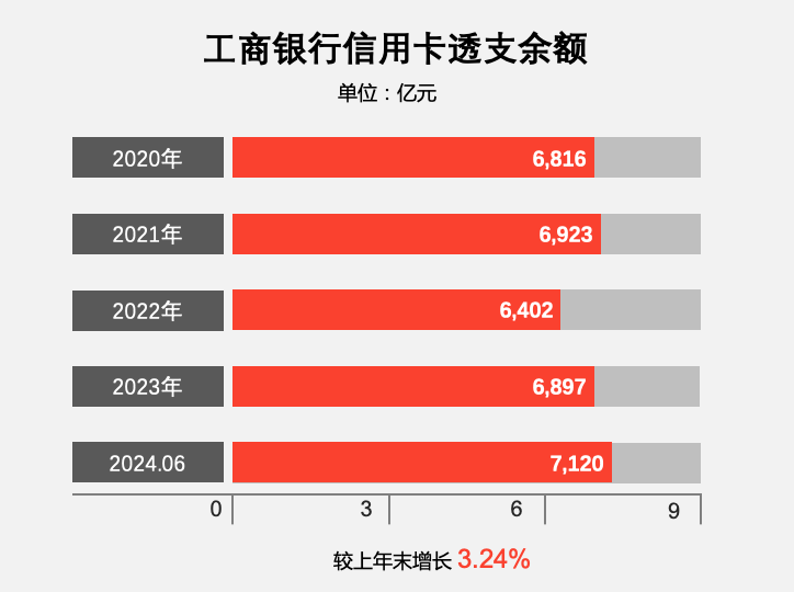截至2024年6月末,工商銀行信用卡透支余額 7,120.49 億元,較上年末增長(zhǎng)3.24%;