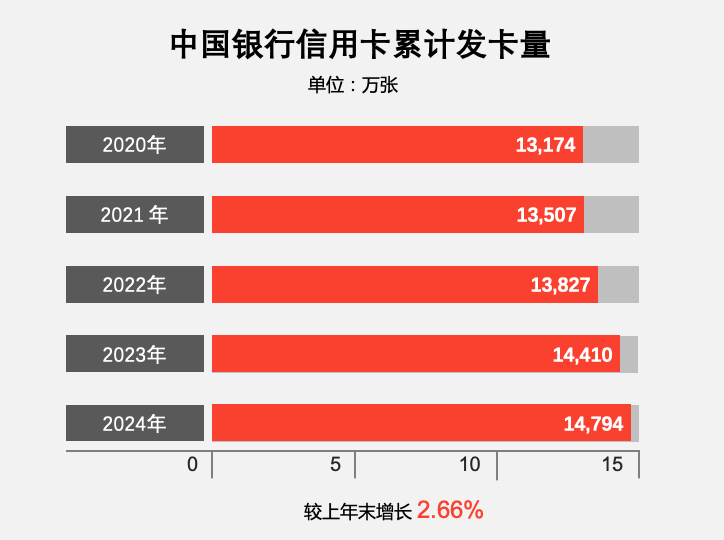 截至2024年末,中國銀行信用卡累計發卡量14,794.04萬張,同比增長2.66%;