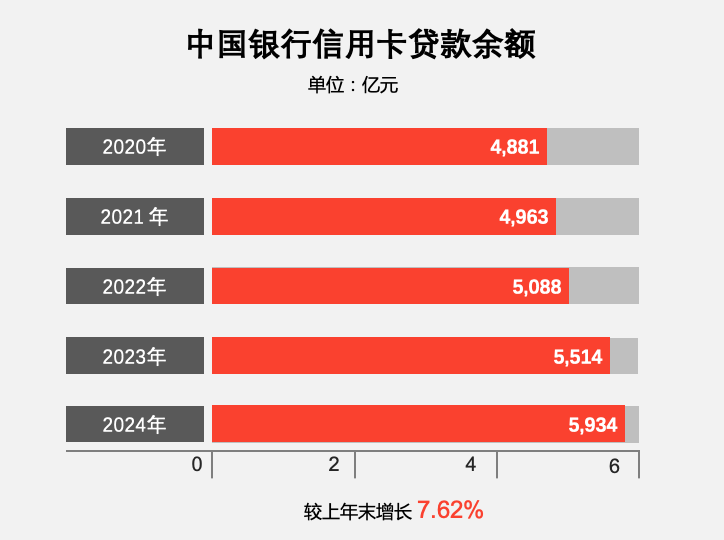 截至2024年末,中國銀行信用卡貸款余額5,934.03億元,同比增長7.62%;
