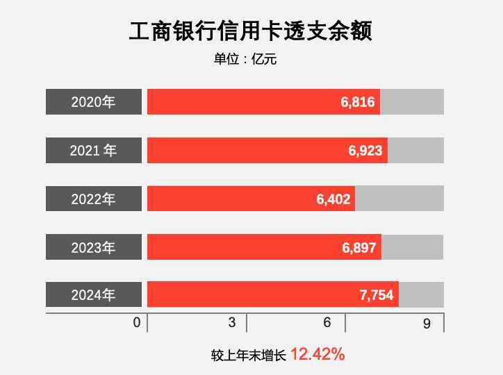 截至2024年末,工商銀行信用卡透支余額7,753.64 億元,較上年增長12.42%;