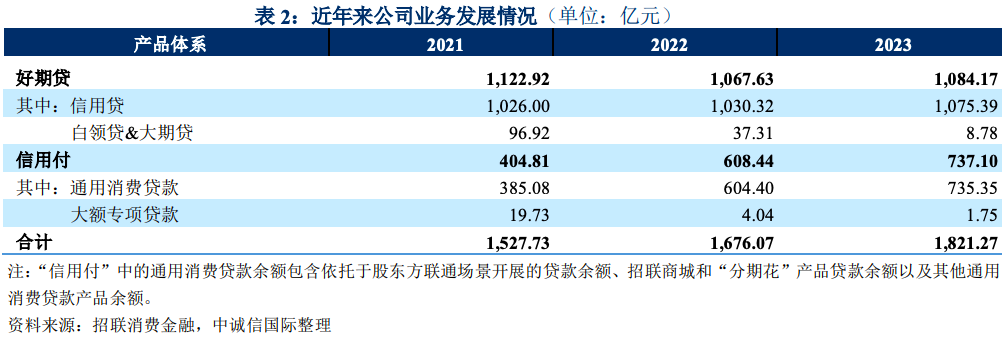 產品體系方面,目前形成了“好期貸”和“信用付”兩大產品體系,以“好期貸”為主。“好 期貸”是自主支付類現金貸款產品,可以在招聯消費金融 APP、微信公眾號以及各類合作方的線 上渠道進行申請;“信用付”是受托支付類分期貸款產品,主要在招聯消費金融自有電商平臺、 股東方中國聯通的消費場景以及與互聯網平臺合作的消費分期中使用。