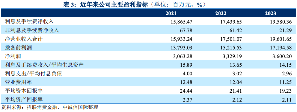 經營效率方面,招聯消費金融進入穩步發展期,營業費用趨于穩定,主要集中于信息技術、研發、 員工費用等,2023 年業務及管理費同比小幅增長 4.66%,營業費用率同比下降 0.79 個百分 點至 11.25%,處于行業較低水平。在上述因素共同影響下,2023 年撥備前利潤同比增長 13.01%。