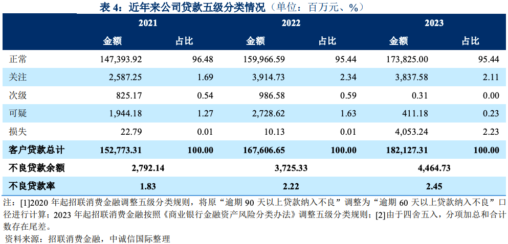 截至 2023 年末,按照逾期 60 天以上貸款納入不良口徑計算,招聯消費金融不良貸款余額較上年末增長 19.85%至 44.65 億元,不良貸款率較上年末上升 0.23 個百分點 至 2.45%。