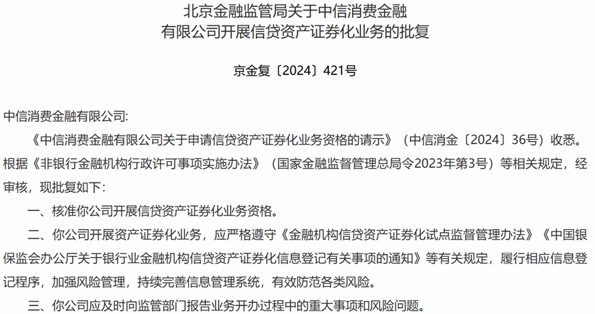 截至目前,31家持牌消金中,已有19家獲得了發行ABS的資格,有13家完成ABS發行。最新獲批ABS發行資格的消息為2024年7月,中信消費金融獲取國家金融監督管理總局北京監管局許可: