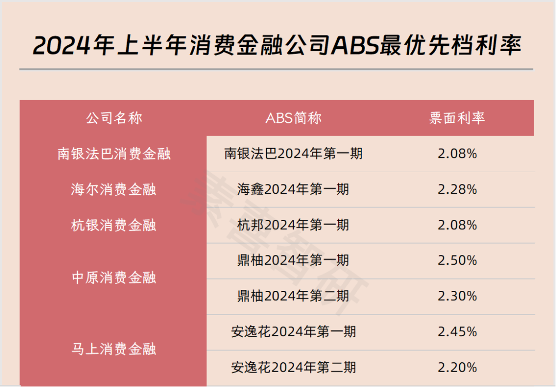 既然存在信用分層,那么對應的利率也會存在相應分層。由于次級檔通常無票面利率,因此優先級資產的對比更具意義。作者統計發現,2024年上半年,杭銀消費金融與南銀法巴消費金融在優先檔拿下了最低利率2.08%,所涉規模分別為7.52億元、9.5億元: