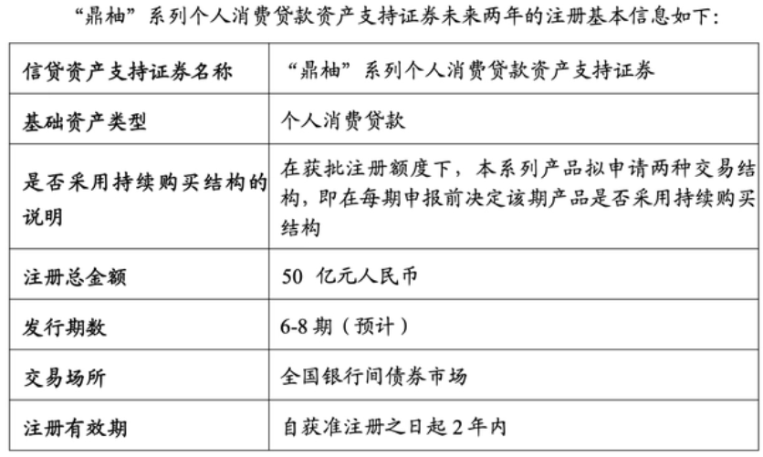 此后,需申請證券代碼、實施備案登記,隨后在銀行間市場掛牌發行。值得一提的是,持牌消費金融多采取儲架式發行,例如中原消費金融曾發布《“鼎柚”系列個人消費貸款資產支持證券的注冊申請報告》: