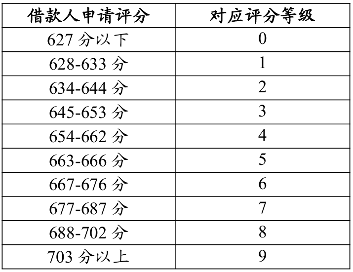 借款人申請?jiān)u分與0-9級(jí)評(píng)分結(jié)果的對應(yīng)情況如下。