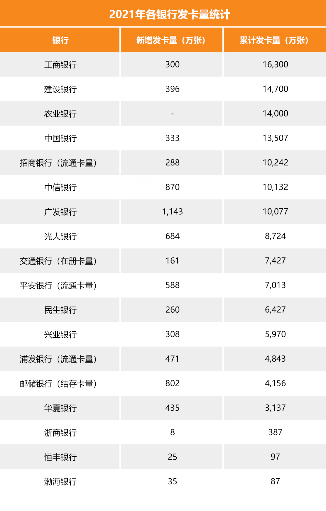 同《2021年支付體系運行總體情況》所體現的信用卡和借貸合一卡發卡速度減緩同步,2021年各大銀行信用卡新增發卡均有所放緩。期中,發卡量最高的為廣發銀行新增發卡1,143萬張,廣發銀行也是唯一一家新增發卡量超過1,000萬張的銀行;其次為中信銀行新增發卡870萬張,郵儲銀行以新增發卡802萬張排名第三。