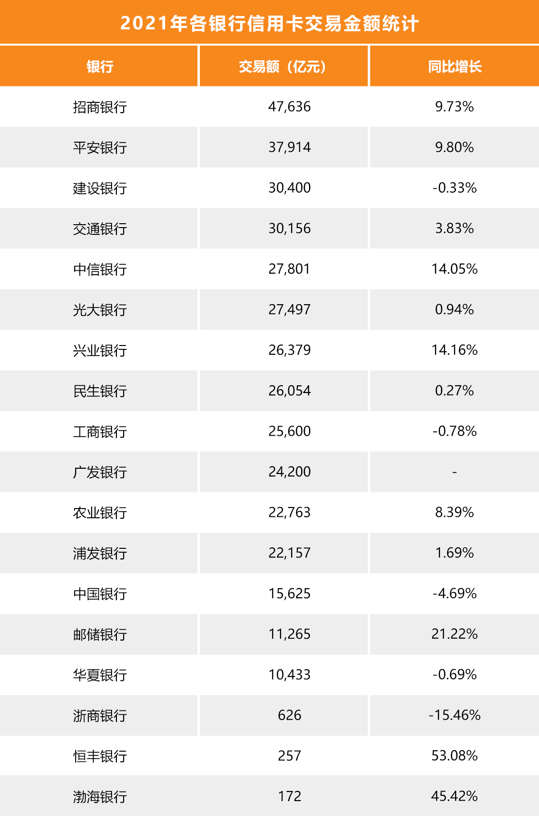 在信用卡交易額方面,招商銀行以信用卡交易額超過4.7萬億元摘得桂冠,同時也是唯一一家交易額超過4萬億元的銀行;其次為平安銀行、建設銀行和交通銀行3家銀行,信用卡交易額均處于3萬億元至4萬億元之間。