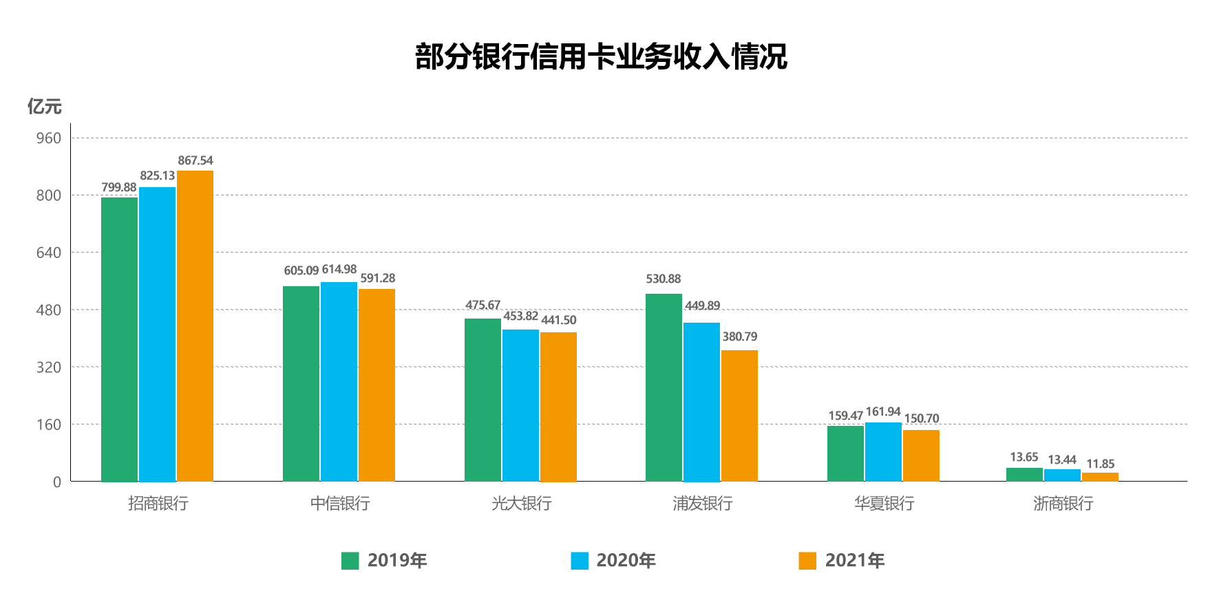從信用卡業務收入情況來看,在6家公布其信用卡業務收入情況的銀行當中,收入最高的為招商銀行達867.54億元,其次為中信銀行591.28億元,而后為光大銀行441.50億元。值得注意的是,招商銀行是唯一一家實現信用卡業務收入正向增長的銀行,信用卡業務收入同比增長5.14%。