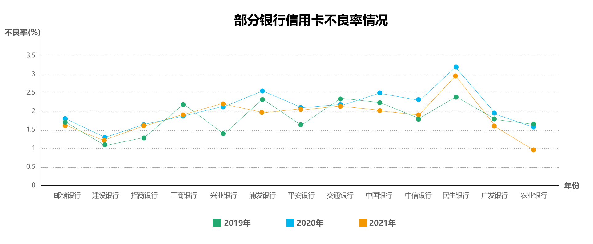 2021年,信用卡行業資產質量較2020年整體向好發展。在12家公布其信用卡不良率的銀行中,僅有2家銀行出現銀行不良率上升的情況,其余10家銀行均實現信用卡不良率不同程度的下降。其中,信用卡不良率下降幅度最大的銀行是農業銀行、中信銀行和浦發銀行,降幅分別為0.56、0.55和0.54個百分點。