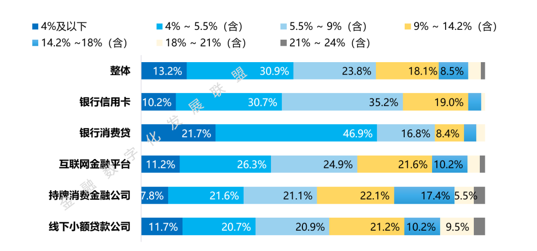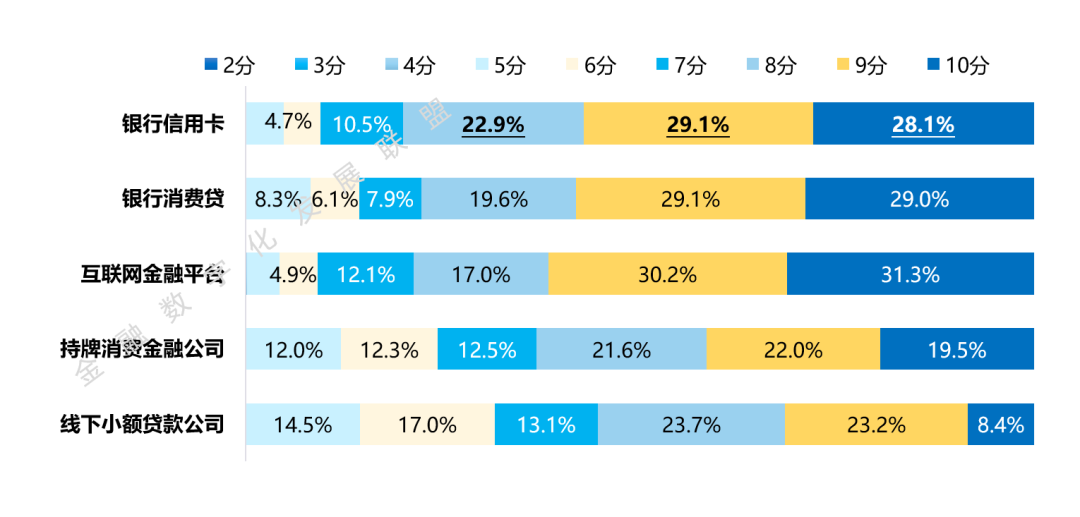 在城市層級(jí)維度,信用卡作為信用支付產(chǎn)品,在三線(xiàn)及以下城市的用戶(hù)占比為35.5%,而現(xiàn)金貸產(chǎn)品和專(zhuān)項(xiàng)消費(fèi)分期產(chǎn)品這一指標(biāo)分別為24.8%、23.0%。信用卡專(zhuān)項(xiàng)消費(fèi)分期產(chǎn)品中,三線(xiàn)及以下城市用戶(hù)占比30.0%,銀行消費(fèi)貸業(yè)務(wù)中這一比例為21%。信用卡現(xiàn)金貸業(yè)務(wù)中,三線(xiàn)及以下城市用戶(hù)占比為19.5%,依舊高于銀行消費(fèi)貸業(yè)務(wù)0.3個(gè)百分點(diǎn)。圖1:各類(lèi)型產(chǎn)品用戶(hù)畫(huà)像差異-整體圖2:各類(lèi)型產(chǎn)品用戶(hù)畫(huà)像差異-分機(jī)構(gòu)圖3:各類(lèi)型機(jī)構(gòu)用戶(hù)畫(huà)像差異-專(zhuān)項(xiàng)消費(fèi)分期圖4:各類(lèi)型產(chǎn)品用戶(hù)畫(huà)像差異-現(xiàn)金貸在用戶(hù)認(rèn)知維度,在信用支付產(chǎn)品上,銀行信用卡的認(rèn)知率與辦理率均超80%,常用率為68.7%%,各項(xiàng)比例均顯著高于其他機(jī)構(gòu)。但對(duì)于現(xiàn)金貸、專(zhuān)項(xiàng)消費(fèi)分期產(chǎn)品,信用卡的認(rèn)知率僅為40.3%和31.6%,較銀行消費(fèi)貸分別低41.1和21.7個(gè)百分點(diǎn);辦理率分別為20.6%和13.7%,較銀行消費(fèi)貸分別低27.9和10.5個(gè)百分點(diǎn);常用率分別為14.3%和26.1%,較銀行消費(fèi)貸分別低9.2和1.5個(gè)百分點(diǎn)。此外,值得關(guān)注的是,在通過(guò)信用卡辦理專(zhuān)項(xiàng)消費(fèi)分期的用戶(hù)中,18-25歲客群占比高出消費(fèi)貸6個(gè)百分點(diǎn),一定程度上表明信用卡得到年輕客群的認(rèn)可。圖5:各類(lèi)型機(jī)構(gòu)現(xiàn)金貸產(chǎn)品的用戶(hù)認(rèn)知率、辦理率與常用率圖6:各類(lèi)型專(zhuān)項(xiàng)消費(fèi)分期產(chǎn)品的用戶(hù)認(rèn)知率、辦理率與常用率在盈利能力維度,信用卡分期用戶(hù)的平均年化利率為9.07%;在現(xiàn)金貸業(yè)務(wù)中,信用卡平均年化利率為7.45%,銀行消費(fèi)貸則為6.37%;在專(zhuān)項(xiàng)消費(fèi)分期業(yè)務(wù)中,兩者基本一致。圖7:用戶(hù)最近一次辦理產(chǎn)品的年化利率-分期產(chǎn)品圖8:年化利率水平-現(xiàn)金貸產(chǎn)品信用卡業(yè)務(wù)的收入來(lái)源包括利息與非利息收入。根據(jù)上市銀行年報(bào)中公開(kāi)的信息,我國(guó)上市銀行零售業(yè)務(wù)收益率集中在5%-6%,信用卡的收益率在零售業(yè)務(wù)中具有顯著優(yōu)勢(shì)。在非利息收入方面,日常交易所帶來(lái)的回傭收入可以大體彌補(bǔ)運(yùn)營(yíng)成本,在深化客戶(hù)經(jīng)營(yíng)的趨勢(shì)下,增值服務(wù)費(fèi)、年費(fèi)等成為銀行新的收入增長(zhǎng)點(diǎn),且通常貢獻(xiàn)非利息收入的用戶(hù)資質(zhì)相對(duì)更優(yōu),風(fēng)險(xiǎn)較小,業(yè)務(wù)盈利更為穩(wěn)健。以上市銀行為樣本進(jìn)行統(tǒng)計(jì),2022年,國(guó)有大行零售業(yè)務(wù)收入及利潤(rùn)占全行的比重平均值分別為50%、46%,股份行為44%、36%,城商行僅為24%、27%,農(nóng)商行為38%、42%,幾乎都在50%以下,這表明我國(guó)銀行零售轉(zhuǎn)型的進(jìn)程仍在繼續(xù),信用卡在提升零售業(yè)務(wù)收入與利潤(rùn)貢獻(xiàn)方面具有重要意義。在用戶(hù)體驗(yàn)維度,整體滿(mǎn)意度上,銀行信用卡客戶(hù)為80.0%,較銀行消費(fèi)貸高出2.3個(gè)百分點(diǎn);在場(chǎng)景豐富度的評(píng)價(jià)中,信用卡同樣居于首位;在用戶(hù)凈推薦值表現(xiàn)上,信用卡為42.0%,銀行消費(fèi)貸則為40.3%。圖9:不同機(jī)構(gòu)、銀行用戶(hù)整體滿(mǎn)意度此外,相比非銀機(jī)構(gòu),調(diào)研發(fā)現(xiàn),偏好使用信用卡的用戶(hù)比例(52.9%)較偏好使用互聯(lián)網(wǎng)金融平臺(tái)或持牌消費(fèi)金融公司類(lèi)信用卡的用戶(hù)(32.1%)高21個(gè)百分點(diǎn),這說(shuō)明以信用卡為抓手,實(shí)現(xiàn)非銀機(jī)構(gòu)消費(fèi)信貸用戶(hù)的轉(zhuǎn)化具有現(xiàn)實(shí)基礎(chǔ)。圖10:用戶(hù)對(duì)信用卡分期/消費(fèi)信貸產(chǎn)品的偏好在獲客成本維度,信用卡線(xiàn)上、線(xiàn)下的獲客成本約290元、234元,而專(zhuān)項(xiàng)消費(fèi)金融產(chǎn)品線(xiàn)上、線(xiàn)下的獲客成本則約328元、268元,銀行信用卡線(xiàn)上、線(xiàn)下獲客成本均低于專(zhuān)項(xiàng)消費(fèi)金融產(chǎn)品。在零售融合經(jīng)營(yíng)維度,就辦理過(guò)銀行多個(gè)產(chǎn)品的用戶(hù)來(lái)看,60%以上的用戶(hù)都是在使用了該機(jī)構(gòu)的信用卡之后,又去辦理了該機(jī)構(gòu)的現(xiàn)金貸或?qū)m?xiàng)分期產(chǎn)品。當(dāng)信用卡提供的現(xiàn)金貸的額度或期限無(wú)法滿(mǎn)足需求時(shí),80.4%的受訪(fǎng)用戶(hù)表示愿意申請(qǐng)發(fā)卡行其他現(xiàn)金貸產(chǎn)品。從職業(yè)分布方面,信用卡用戶(hù)中經(jīng)營(yíng)者的占比高出銀行消費(fèi)貸5個(gè)百分點(diǎn),而白領(lǐng)的占比則較銀行消費(fèi)貸低5個(gè)百分點(diǎn),同時(shí)調(diào)研發(fā)現(xiàn),對(duì)于辦理過(guò)現(xiàn)金貸產(chǎn)品的經(jīng)營(yíng)者來(lái)說(shuō),超過(guò)半數(shù)的經(jīng)營(yíng)者出于申請(qǐng)繁瑣、材料多、門(mén)檻高等原因不愿意申請(qǐng)小微企業(yè)貸,這表明如果銀行能通過(guò)信用卡助力小微業(yè)務(wù)簡(jiǎn)化流程、
