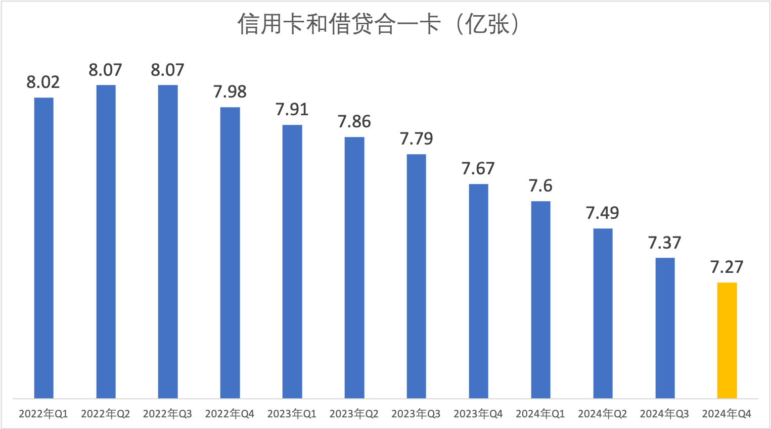 央行近期發(fā)布了《2024年支付體系運行總體情況》,截至2024年末,全國信用卡和借貸合一卡7.27億張,同比下降5.14%,人均持有信用卡和借貸合一卡0.52張。