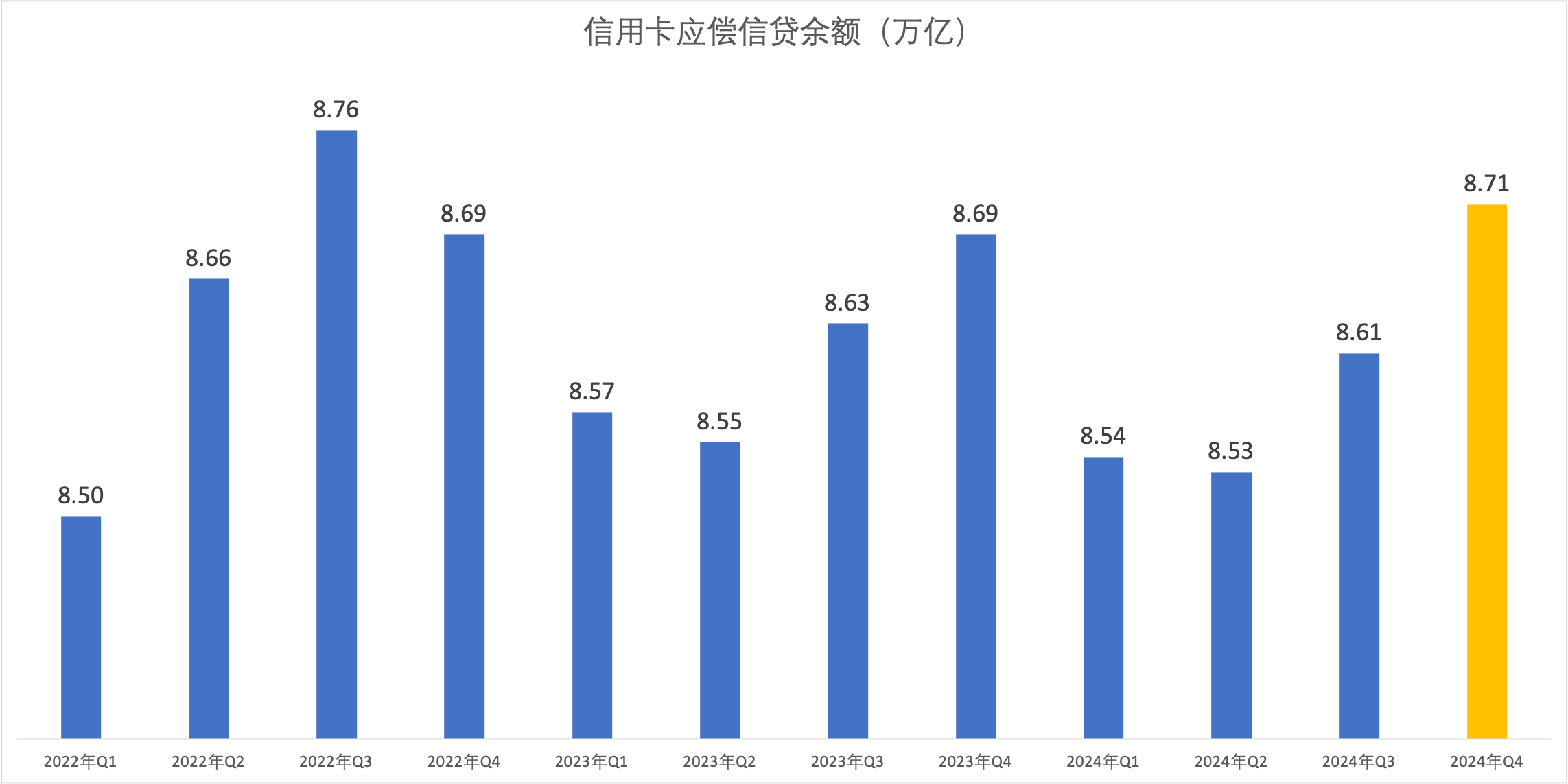 截至 2024 年末,信用卡(包含借貸合一卡)應(yīng)償信貸余額為8.71 萬億元,同比增長 0.25%。卡均授信額度3.14 萬元,授信使用率為38.03%,有所回升;