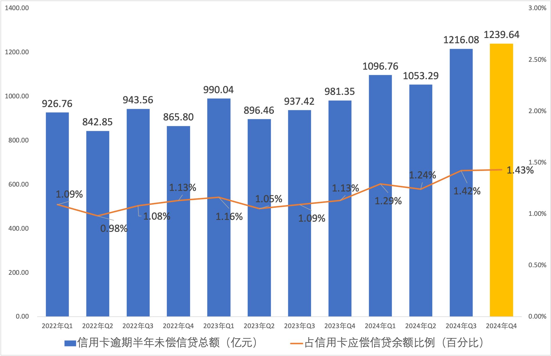 截至 2024 年末,信用卡逾期半年未償信貸總額1239.64 億元,環(huán)比上季度末有所增加,占信用卡應(yīng)償信貸余額的 1.43%。