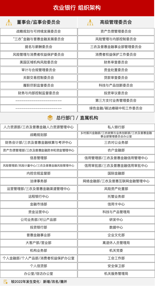 2023年,農業銀行組織架構圖如下,與2022年披露的信息相比,農業銀行組織架構無變化。