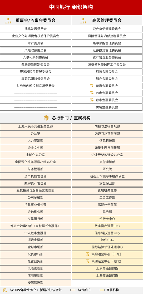 與2022年披露的信息相比,中國銀行組織架構調整如下: