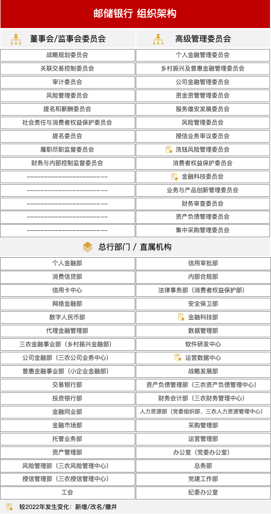 與2022年披露的信息相比,郵儲銀行組織架構調整如下