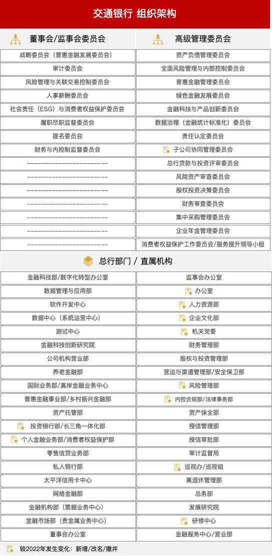 與2022年披露的信息相比,交通銀行組織架構調整如下