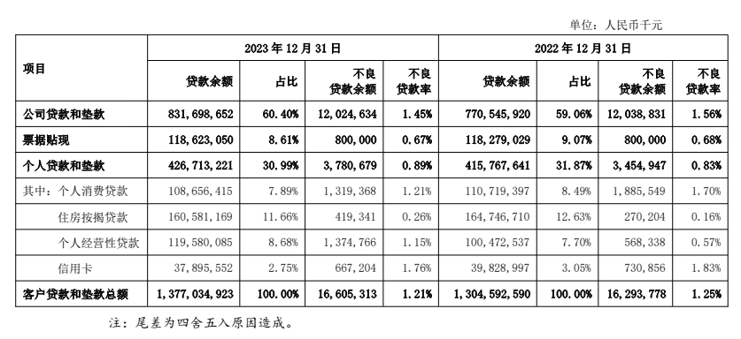 個人貸款方面,加大穩定、優質的零售中長期貸款配置,積極發展住房金融和汽車金融等,力促消費復蘇與提振,持續提升零售信貸重點產品的價值創造。個人消費貸款1,086.56億元,占比7.89%,住房按揭貸款1,605.81億元,占比11.66%,個人經營性貸款1,195.80億元,占比8.68%,信用卡余額378.96億元,占比2.75%。