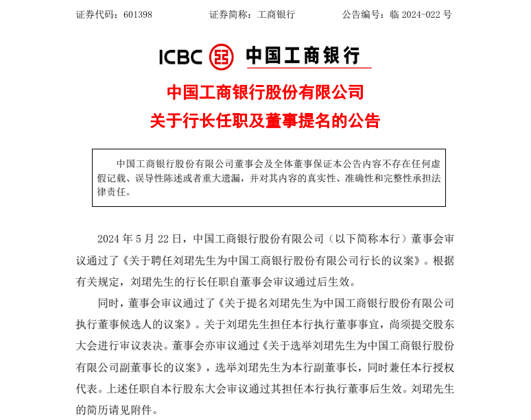 5月22日,工商銀行發布公告稱,該行董事會同意聘任劉珺先生為行長,同時選舉劉珺為副董事長,提名執行董事候選人,同時兼任該行授權代表。